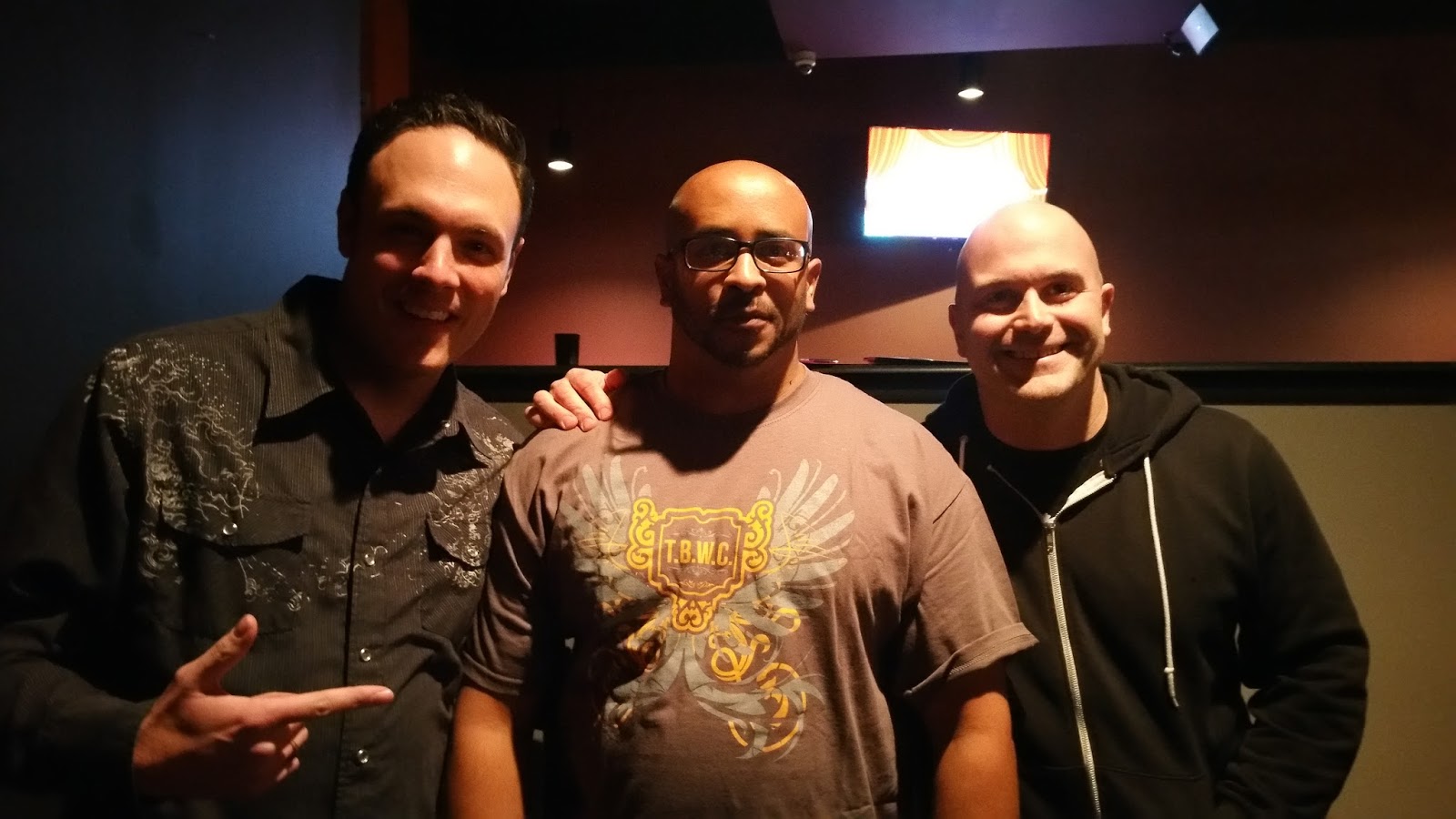 The Boom Wear Company owner Gilbert Chilvas enjoying this photo op with the very cool comedians Tony Pusateri(L) and Mike Finola(R).